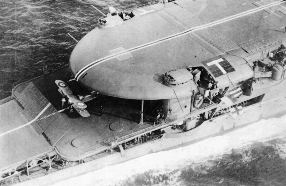 Argus in the late 1920s with a Flycatcher landing on. The 'T' marks the position of the retractable navigation bridge which lay flush with the flightdeck while flying was in progress. The lines of the original merchantile hull can be clearly seen. Palisades line the slides of the flightdeck and a steam wind indicator is fitted in the bows to ensure that the ship is headed directly into wind while landing on aircraft.