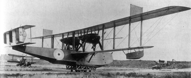 View of N126 at the MAEE, Isle of Grain, where it underwent official trials in 1924. A Fairey Flycatcher seaplane is visible behind, under the port wing.