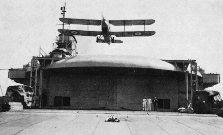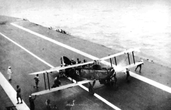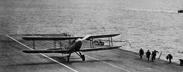 A Fairey IIIF of No. 443 Flight is saved by the palisades