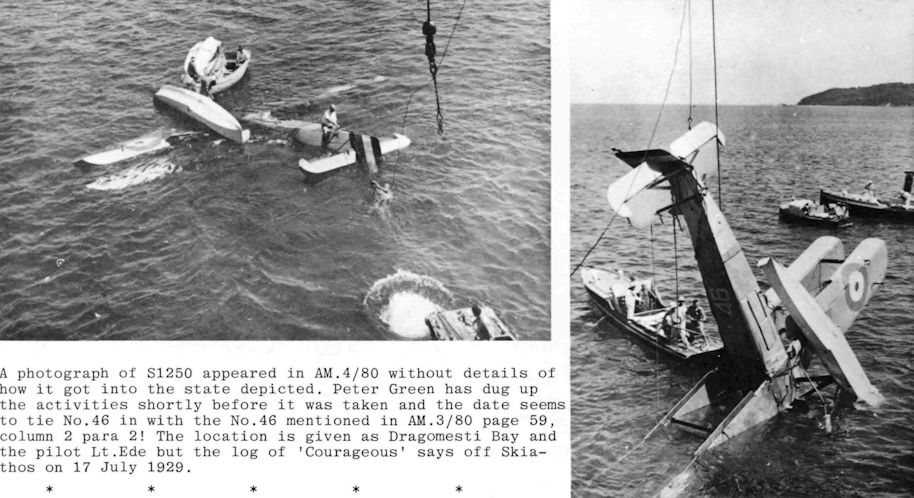 Регистрационный номер: S1250 [2] A photograph of S1250 appeared in AM.4/80 without details of how it got into the state depicted. Peter Green has dug up the activities shortly before it was taken and the date seems to tie No.46 in with the No.46 mentioned in AM.3/80 page 59, column 2 para 2! The location is given as Dragomesti Bay and the pilot Lt.Ede but the log of 'Courageous' says off Skiathos on 17 July 1929.