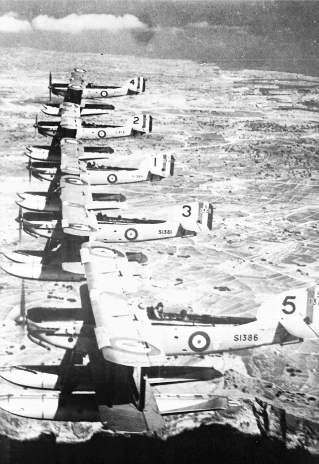 MEDITERRANEAN MEDLEY. Two Supermarine Seagull Vs, three Fairey III Fs, and four Hawker Ospreys, all catapulted from ships of the Mediterranean Fleet, in the act of assuming a line abreast formation over Alexandria. The official name of the Seagull V, when used by the Fleet Air Arm, is Walrus; the original title for it is retained by Australia.