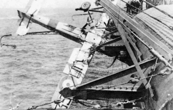 Регистрационный номер: S1250 [2] The circumstances of the accident are not known. S1250 carries the Fleet Number '46' and appears to have been a carrier aircraft mounted on floats while the carrier was in harbour. A float has come off and a wing damaged; probably repairable.