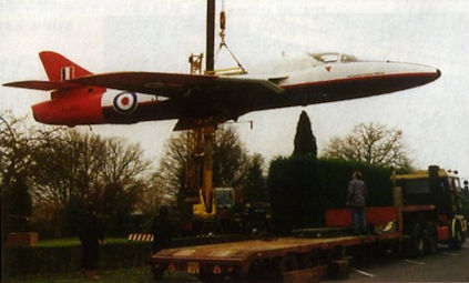 Регистрационный номер: XL563 [2] Having been lifted from its display plinth at Farnborough on March 25, 1999, Hunter XL563 edges toward the flatbed truck which was to take it to its new home.
