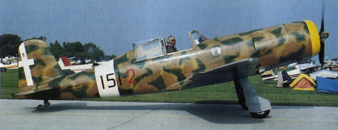 An unusual early morning call for some of the 40,000 campers at Oshkosh, as Rudy Frasca’s 360 h.p. Vedeneyev-powered Fiat G.46 taxies by. The nine-cylinder Russian engine replaces the 250 h.p. Gipsy Queen originally fitted to the G.46 (MM.53097), which has been painted to represent a Fiat G.50.