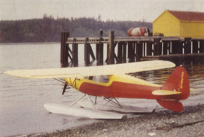 Jack Pickup’s Piper Super Cruiser beached, probably at Alert Bay circa 1950. The distinctive red-and-yellow colour scheme made it the best-known aeroplane in the area at the time. Note the additional water-rudder, vital to help longitudinal control when taxying