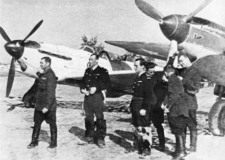 Пилоты «Нормандии» Ж. Риссо, Р. Дервиль (погиб 13 апреля 1943 г.) и Н. Кастелен (погиб 17 июля 1943 г.) на фоне Як-1б. Начало апреля 1943 г.
