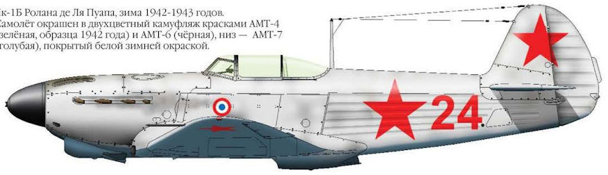 Як-1Б Ролана де Ля Пуапа, зима 1942-1943 годов. Самолёт окрашен в двухцветный камуфляж красками АМТ-4 (зелёная, образца 1942 года) и АМТ-6 (чёрная), низ - АМТ-7 (голубая), покрытый белой зимней окраской.