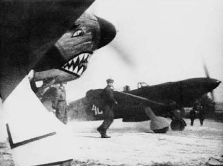 Французские летчики аспиранты Дюран и Риссо позируют на фоне истребителя Альбера Дюрана, который как "Як" Ролана де Ла Пуапа нес изображение акульей пасти.