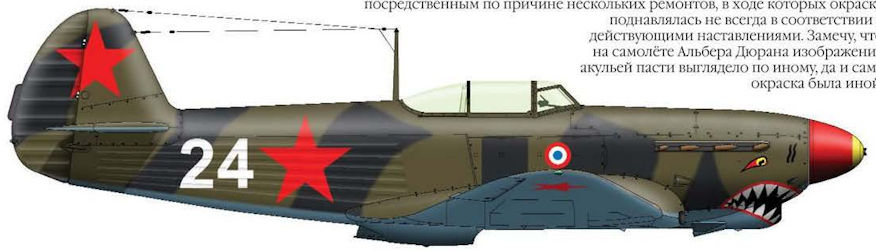 Як-1Б Ролана де ля Пуапа, май-июнь 1943 года. Самолёт окрашен в двухцветный камуфляж красками АМТ-4 (зеленая, образца 1942 года) и АМТ-6 (черная), низ - АМТ-7 (голубая). Как можно судить по немногочисленным фотографиям, качество окраски истребителя было весьма посредственным по причине нескольких ремонтов, в ходе которых окраска подновлялась не всегда в соответствии с действующими наставлениями. Замечу, что на самолете Альбера Дюрана изображение акульей пасти выглядело по иному, да и сама окраска была иной.