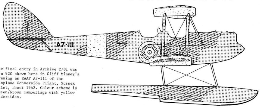 Регистрационный номер: A7-111 [2] The final entry in Archive 2/81 was c/n 920 shown here in Cliff Minney's drawing as RAAF A7-111 of the Seaplane Conversion Flight, Sussex Inlet, about 1942. Colour scheme is green/brown camouflage with yellow undersides.
