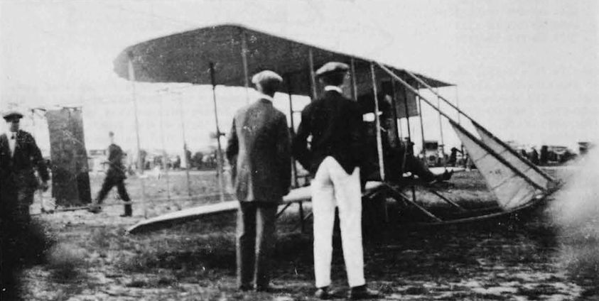 Alec Ogilvie (left) with Wilbur Wright at Eastchurch, probably during the latter’s visit to Eastchurch to help Ogilvie with his repairs and preparations for the Gordon Bennett race on July 1, 1911. Note the early example of Ogilvie’s spring-loaded airspeed indicator attached to the forward strut.
