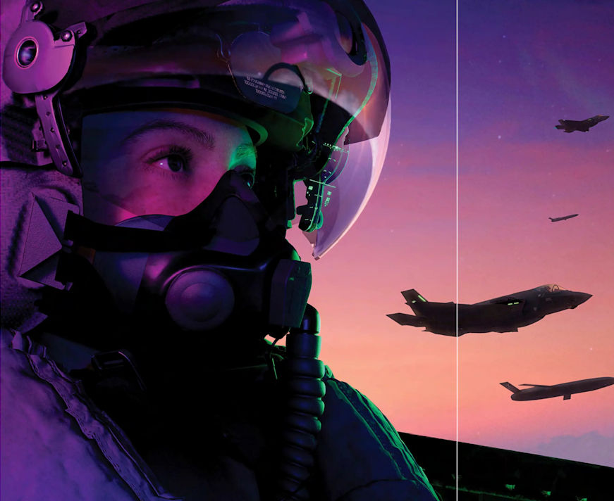 The custom-fit carbon fibre F-35 helmet weights less than 2kg, and its integrated display connects the pilot with the aircraft.