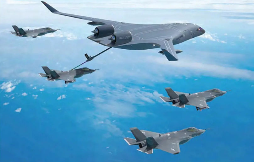 An artist’s impression of the LMXT using the boom system to refuel an F-35A. A hose and drogue system can refuel two aircraft simultaneously, but the boom is more stable and can transfer fuel more quickly