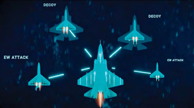 The Jackdaw is intended to be reusable but is cheap enough to be expendable if required. It is capable of a number of uses. Four are seen in this image, supporting an F-35 by acting as decoys and jammers