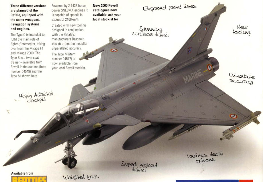 Dassault Rafale B, with additional side views of single-seat Rafale C (centre) and navalised Rafale M (bottom) (1996)