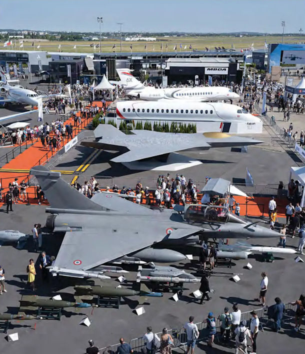 Dassault's later NGF concept, seen here flanked by a Rafale and a Falcon 10X cabin mock-up, remains a relatively small aircraft - significantly smaller than Airbus' version of NGF, much smaller than the US NGAD is likely to be, and dwarfed by the rival Anglo-Italian-Japanese GCAP concept