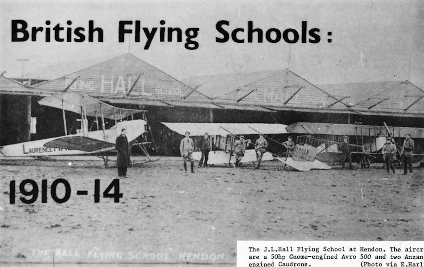 The J.L.Hall Flying School at Hendon. The aircraft are a 50hp Gnome-engined Avro 500 and two Anzani-engined Caudrons.